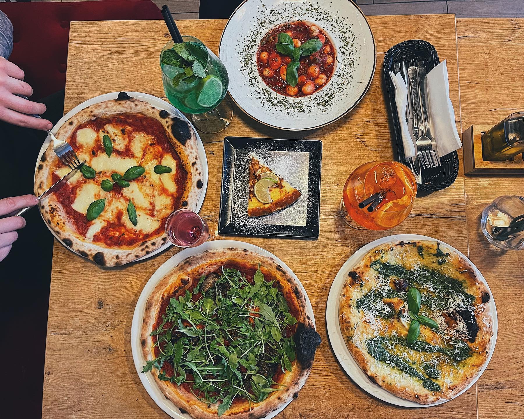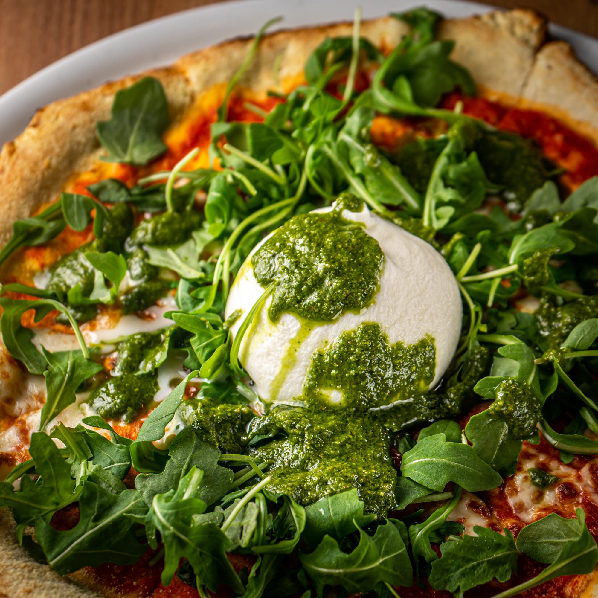 sos pomidorowy, mozzarella fior di latte, kulka sera burrata, rukola, zielone pesto -